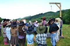 Tábor I - WesternSlunce se sklání k obzoru. Kapky potu stékají po drsných tvářích pistolníků. Ruce, ačkoli jsou naprosto v klidu, mají svaly napnuté k prasknutí. Oči strnule sledují protivníka. Takto strnule stojí už minuty – možná víc. Čas určují jen hodiny na věži, sekundová ručička chybí, jen minutová ukáže správnou chvíli... Tento obrázek jistě znáte z filmů plných neohrožených mužů, rudých indiánů a krásných dívek. Než se však naši hrdinové chopí svých nenabitých celodřevěných koltů a trefí se do elektronického tlačítka mistra Lazara, které neomylně určí, kdo je nejrychlejším pistolníkem v širém kraji, vězte, že divoký západ z knížek Karla Maye nebo z drsných filmů Hollywoodu najdete i mezi Valašským Meziříčím a Vsetínem – v malé obci Bystřička. Letos vyrostlo na známé louce paní Michalíkové westernové městečko s vlastním hangárovým saloonem, indiánským teepee a spoustou stanových domečků s mnoha dalšími důležitými lidmi. Společně s dvaačtyřiceti dětmi jsme se prostříleli třemi týdny plných dobrodružství a nebezpečných situací. Jistě si říkáte, co za „dobrodrůžo“ asi malé děti mohou zažít, ale zvažte, jestli byste zvládli zastavit vlak pouze s koněm, zdali byste vystopovali bandity, kteří unesli prezidenta nebo osvobodili spoustu otroků ze spárů otroctví. Děti to zvládly a ještě se u toho královsky bavily. Společně strávené chvíle nám dlouho zůstanou v paměti a doufejme, že se nás co nejvíce sejde i příští rok na stejném místě. |